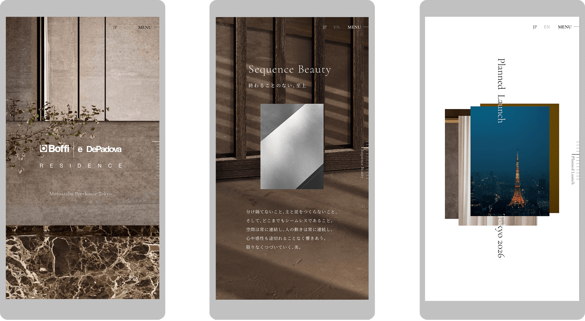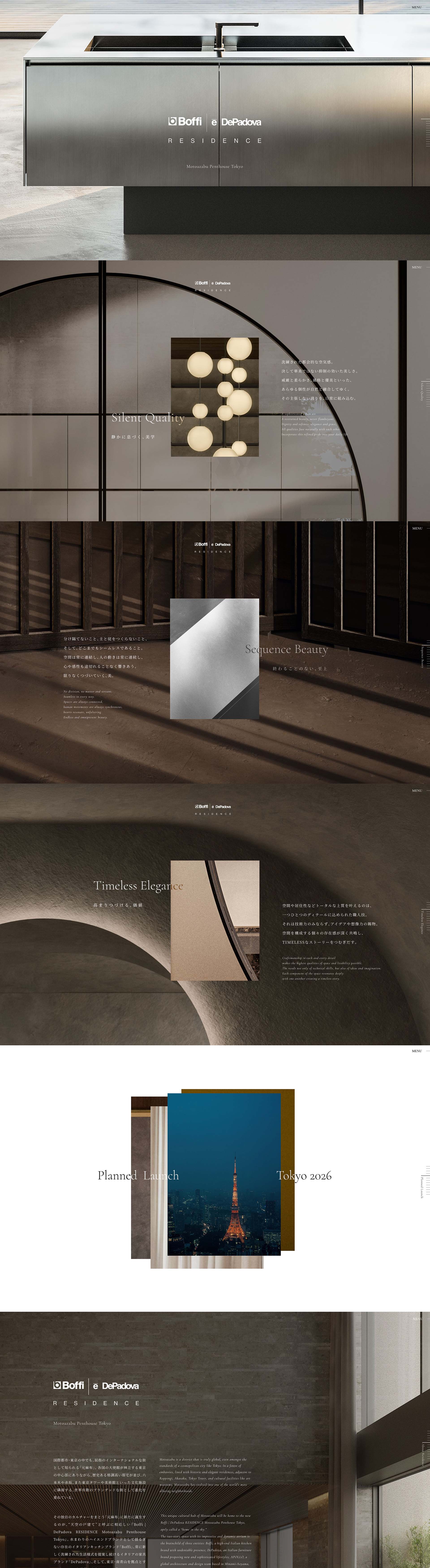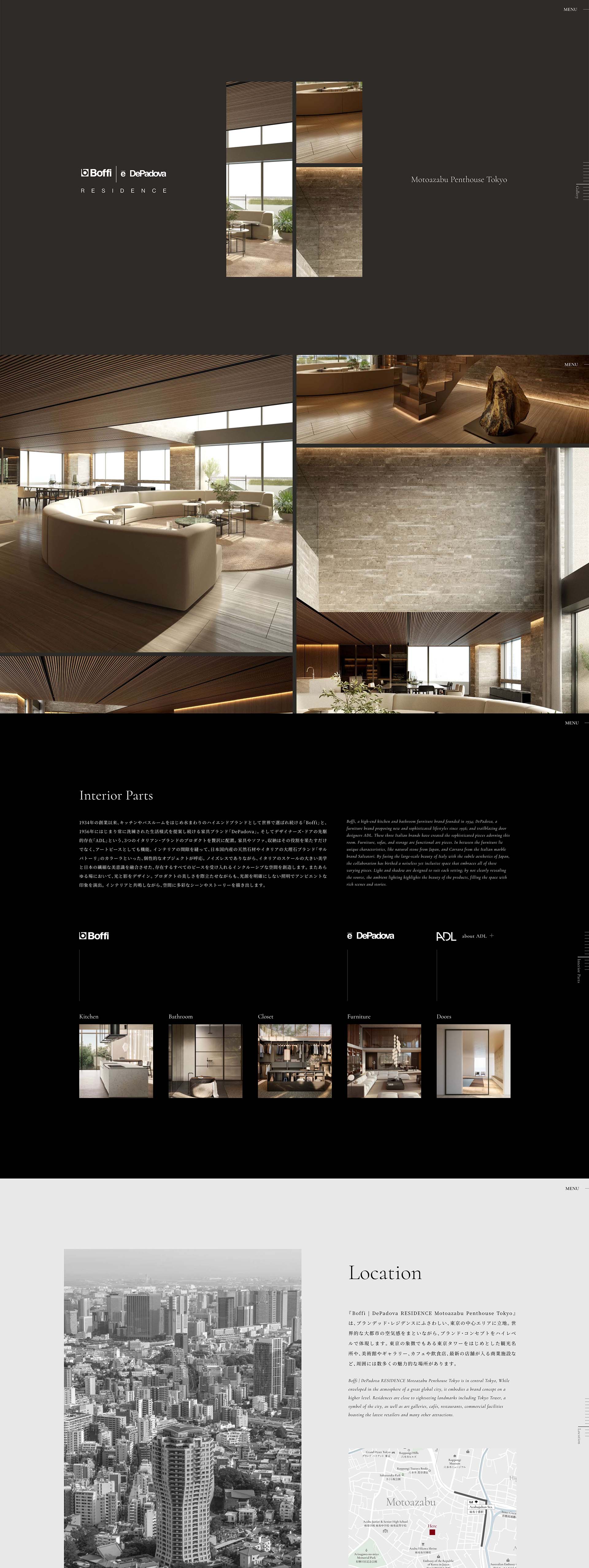 イタリアのキッチンブランド「Boffi」家具ブランド「DePadova」と設計事務所APOLLOとのコラボレーションによって元麻布ヒルズ内に誕生するレジデンスBoffi | DePadova RESIDENCE Motoazabu Penthouse Tokyoの特設サイト。ビジュアルや言葉で紡ぐ、コンセプトや美意識を優先した表現のサイトとなっている。