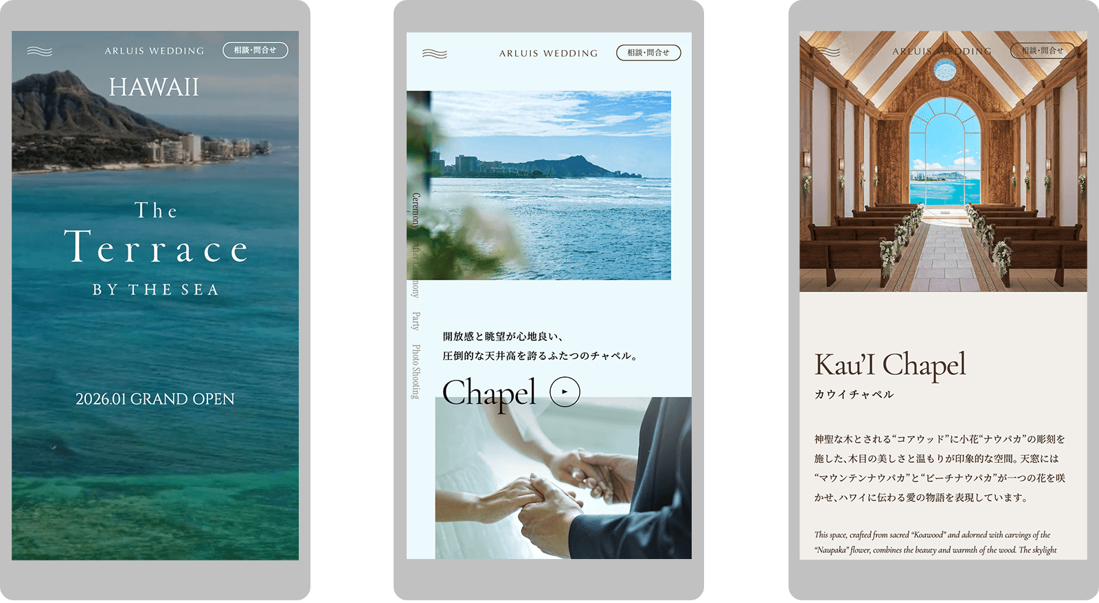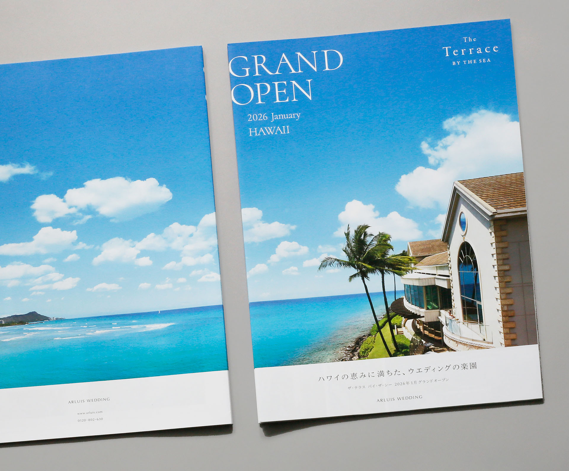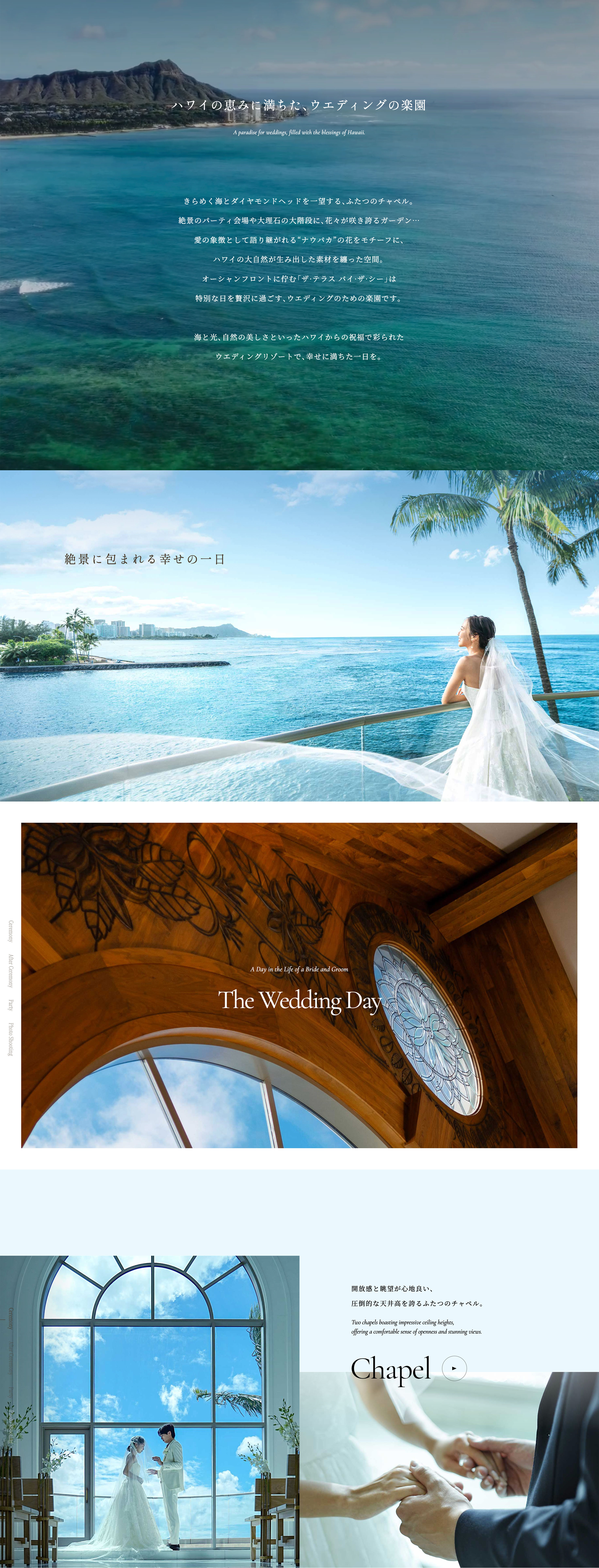 ARLUIS WEDDINGが運営するハワイ・オアフ島のチャペル「ザ・テラス バイ・ザ・シー」の特設WEBサイトやパンフレットのデザイン。ホノルルの海とダイヤモンドヘッドを一望するふたつのチャペルを備え、完全に独立した施設としてリブランディングされた施設の魅力を、WEBや印刷物の特性を活かしながらダイレクトに伝える表現を目指し、動画や写真をふんだんに盛り込んだWEBサイトやA3サイズの大判パンフレットとなっている。