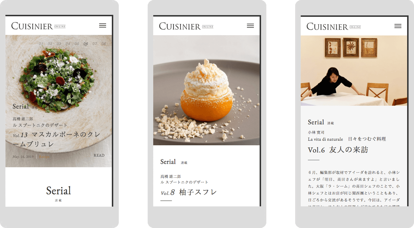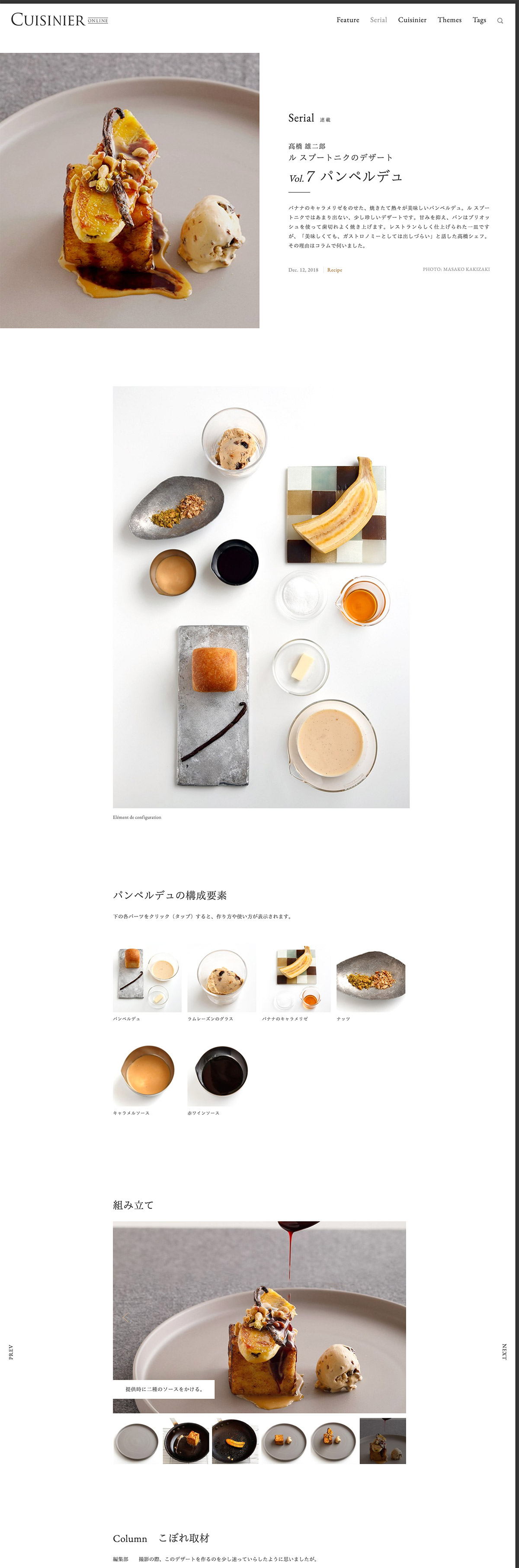 キュイジニエ・オンラインは、料理人(cuisinier、cuisiniere)の方々を中心にとりあげたウェブマガジン。調理技術のほか、インタビュー、暮らしぶりなど、料理人の考えや、生活により近い部分も紹介している。ウェブサイト用のロゴもオリジナルデザイン。