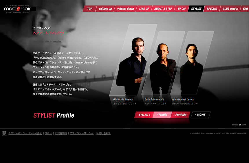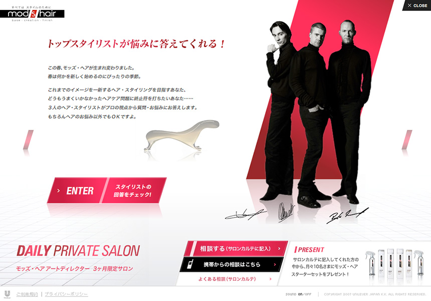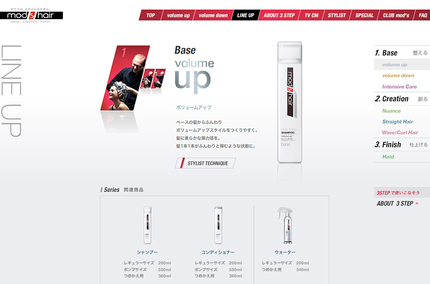 モッズヘアのシャンプー関連の商品を紹介するサイト。ロゴマークのエレメントである赤い平行四辺形をモチーフに空間的な演出を施したデザイン。