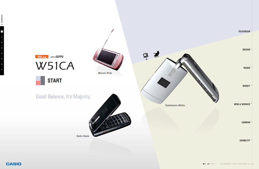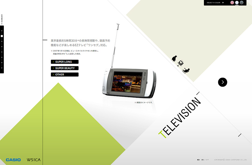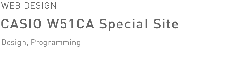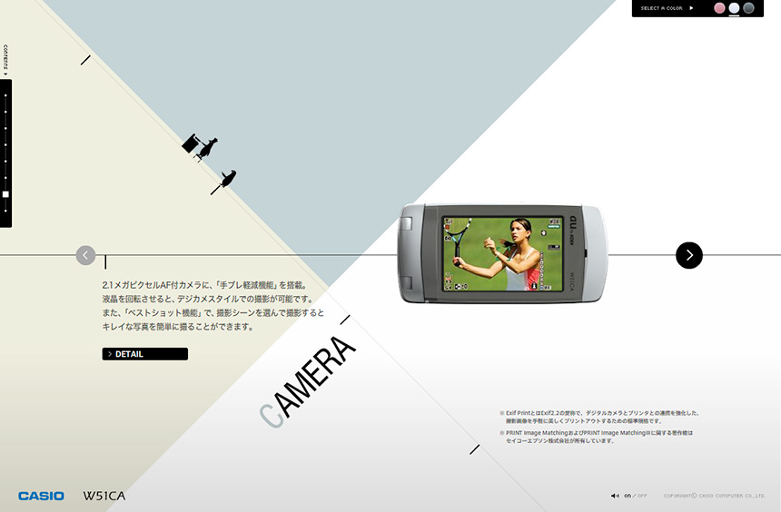 CASIOの携帯電話W51CAのスペシャルサイト。背景の構成された色面がズームや回転で奥行き感を強く感じさせるダイナミックなインターフェイス。